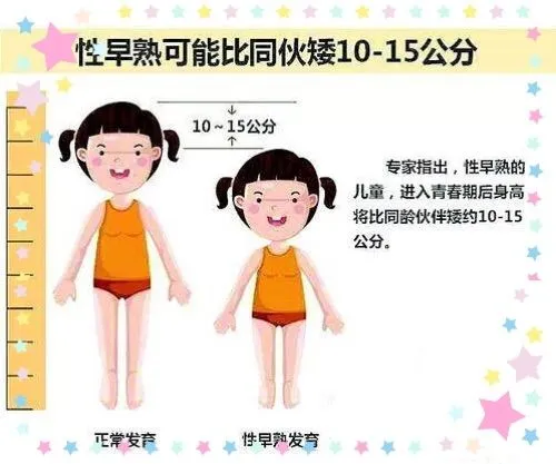 此外第二性征出现的同时,还会伴随着孩子骨骼生长加速,也就是出现“身高猛长"的现象。导致孩子骨骺线提前闭合,成年之后,身高较同龄人来说,会比较矮。